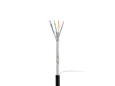 Copper Cable, Category 7, 4-pair, 23AWG, S/FTP, Outdoor / Indoor LSZH (IEC 60332-1) Euroclass B2ca – s1a, d1, a1, Black outer jacket, White inner jacket, 500 meter reel