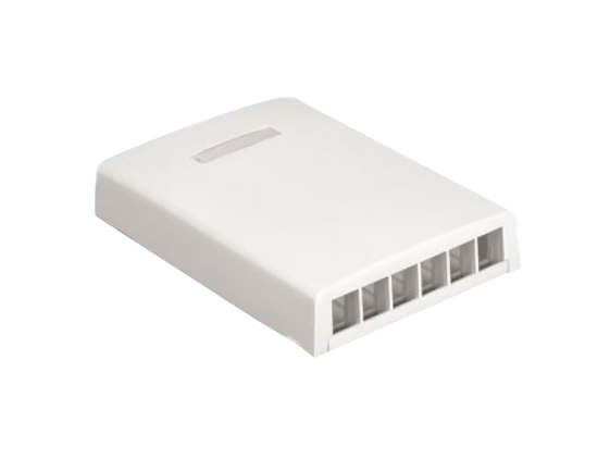 The NetKey® Multimedia Surface Mount Box accepts six keystone modules. A built-in fiber spool in the base protects and secures cable slack in place. It offers a variety of mounting options using adhesive tape or screws. The box includes a label pocket for