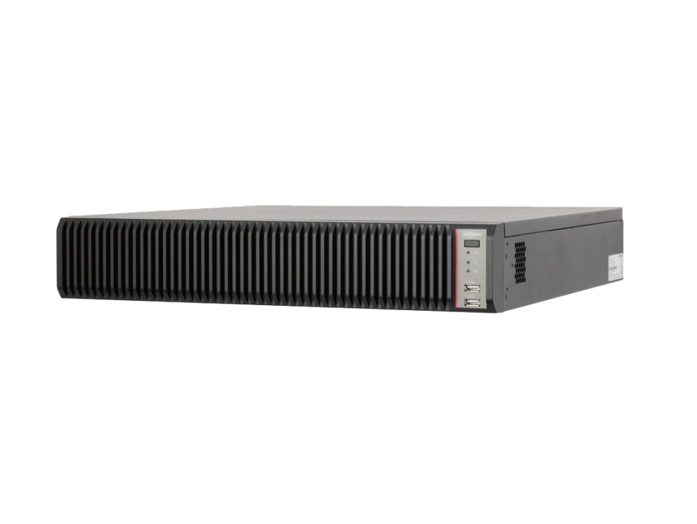 Server 128 canali IP fino a 32 MP, massima banda 400 Mbps (registrazione 320 Mbps), 5 uscite video (3 HDMI + 2 VGA), 16 ingressi e 8 uscite allarme, 1 ingresso e 2 uscite audio, predisposto per montaggio di 8 Hard Disk SATA (fino a 16 TB cad.) anche in RAID 0/1/5/6/10/50/60, 4 porte USB (2 2.0 e 2 3.0), 1 porta eSATA, 1 porta RS232, 1 porta RS485, 4 LAN 1.000 Mbps, face recognition e face detection (12 canali), metadati (12 canali), protezione perimetrale, ANPR, alimentazione 240 Vac più di 105 W