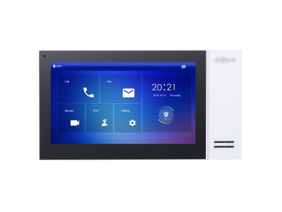 Monitor interno videocitofonico IP con finiture bianche, display LCD da 7″, risoluzione 1024×600, 1 porta LAN 100 Mbps, touch screen capacitivo, 6 ingressi e 1 uscita allarme, micro SD 8 GB embedded, montaggio a parete o desktop (con staffa VTM123), alimentazione 12 Vdc/PoE 5 W