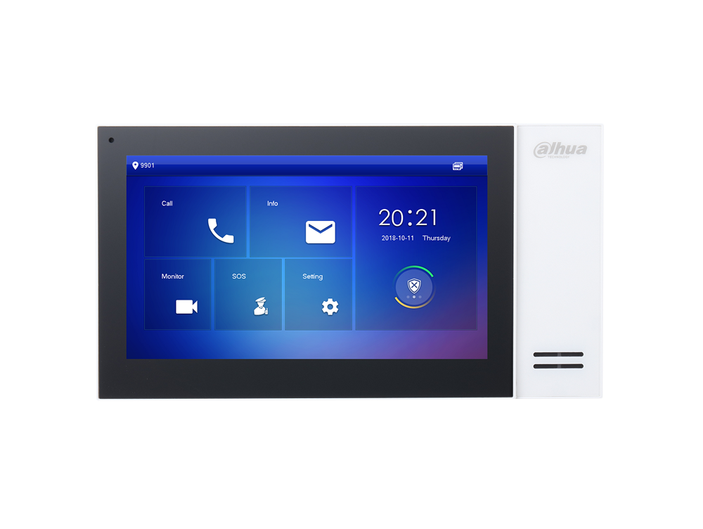 Monitor interno videocitofonico IP con finiture bianche, display LCD da 7″, risoluzione 1024×600, 1 porta LAN 100 Mbps, touch screen capacitivo, 6 ingressi e 1 uscita allarme, slot micro SD, montaggio a parete o desktop (con staffa VT